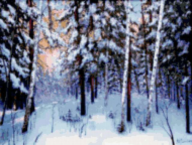Ориентировочно так, схема вышивки «Landscape», созданная автором aniela, будет выглядеть при отшиве на канве. Размер данной вышивки равен 190x144 крестов, при этом используется 65 цветов. Ключевые слова, по которым можно найти эту схему: winter, пейзаж, landscape, зима. Также, вы можете взглянуть на оригинальную картинку, соответствующую данной схеме вышивки.