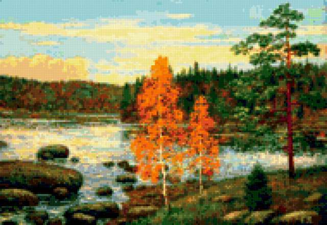 Ориентировочно так, схема вышивки «Landscape», созданная автором aniela, будет выглядеть при отшиве на канве. Размер данной вышивки равен 190x131 крестов, при этом используется 80 цветов. Ключевые слова, по которым можно найти эту схему: пейзаж, landscape. Также, вы можете взглянуть на оригинальную картинку, соответствующую данной схеме вышивки.