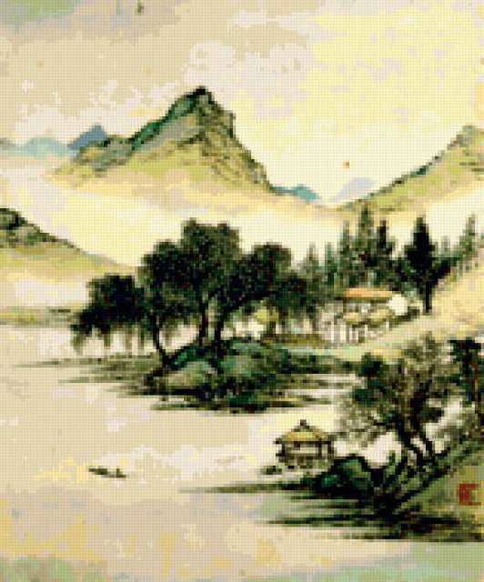 Ориентировочно так, схема вышивки «Landscape», созданная автором aniela, будет выглядеть при отшиве на канве. Размер данной вышивки равен 158x190 крестов, при этом используется 64 цветов. Ключевые слова, по которым можно найти эту схему: пейзаж, landscape. Также, вы можете взглянуть на оригинальную картинку, соответствующую данной схеме вышивки.