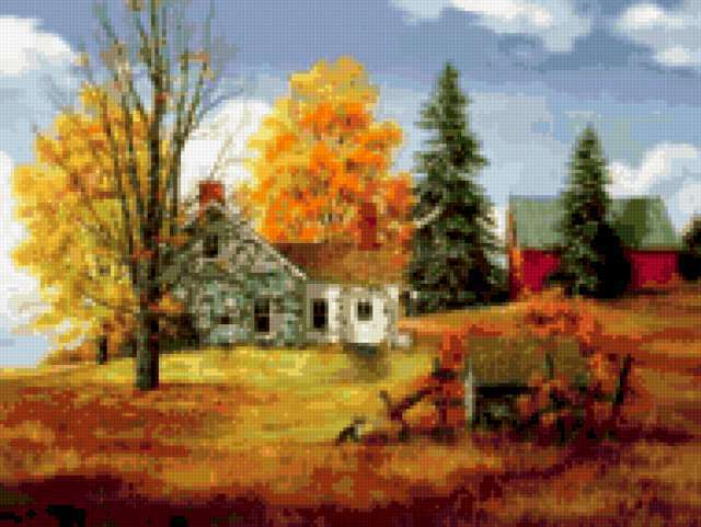 Ориентировочно так, схема вышивки «Landscape», созданная автором aniela, будет выглядеть при отшиве на канве. Размер данной вышивки равен 190x143 крестов, при этом используется 81 цветов. Ключевые слова, по которым можно найти эту схему: пейзаж, landscape. Также, вы можете взглянуть на оригинальную картинку, соответствующую данной схеме вышивки.