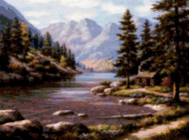 Ориентировочно так, схема вышивки «Landscape», созданная автором aniela, будет выглядеть при отшиве на канве. Размер данной вышивки равен 190x141 крестов, при этом используется 66 цветов. Ключевые слова, по которым можно найти эту схему: пейзаж, landscape. Также, вы можете взглянуть на оригинальную картинку, соответствующую данной схеме вышивки.