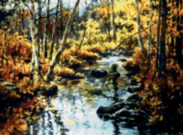 Ориентировочно так, схема вышивки «Landscape», созданная автором aniela, будет выглядеть при отшиве на канве. Размер данной вышивки равен 190x141 крестов, при этом используется 77 цветов. Ключевые слова, по которым можно найти эту схему: пейзаж, landscape. Также, вы можете взглянуть на оригинальную картинку, соответствующую данной схеме вышивки.