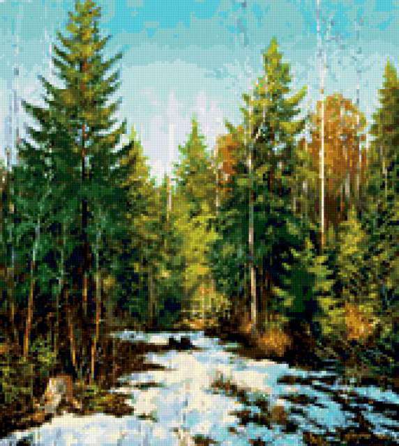 Ориентировочно так, схема вышивки «Landscape», созданная автором aniela, будет выглядеть при отшиве на канве. Размер данной вышивки равен 170x190 крестов, при этом используется 77 цветов. Ключевые слова, по которым можно найти эту схему: пейзаж, landscape. Также, вы можете взглянуть на оригинальную картинку, соответствующую данной схеме вышивки.