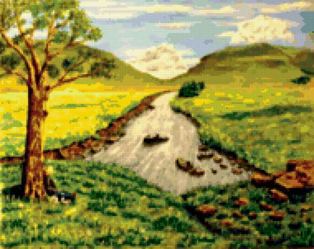 Ориентировочно так, схема вышивки «Landscape», созданная автором aniela, будет выглядеть при отшиве на канве. Размер данной вышивки равен 190x151 крестов, при этом используется 77 цветов. Ключевые слова, по которым можно найти эту схему: пейзаж, landscape. Также, вы можете взглянуть на оригинальную картинку, соответствующую данной схеме вышивки.