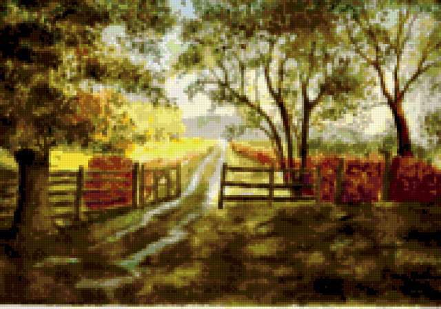 Ориентировочно так, схема вышивки «Landscape», созданная автором aniela, будет выглядеть при отшиве на канве. Размер данной вышивки равен 190x133 крестов, при этом используется 73 цветов. Ключевые слова, по которым можно найти эту схему: пейзаж, landscape. Также, вы можете взглянуть на оригинальную картинку, соответствующую данной схеме вышивки.