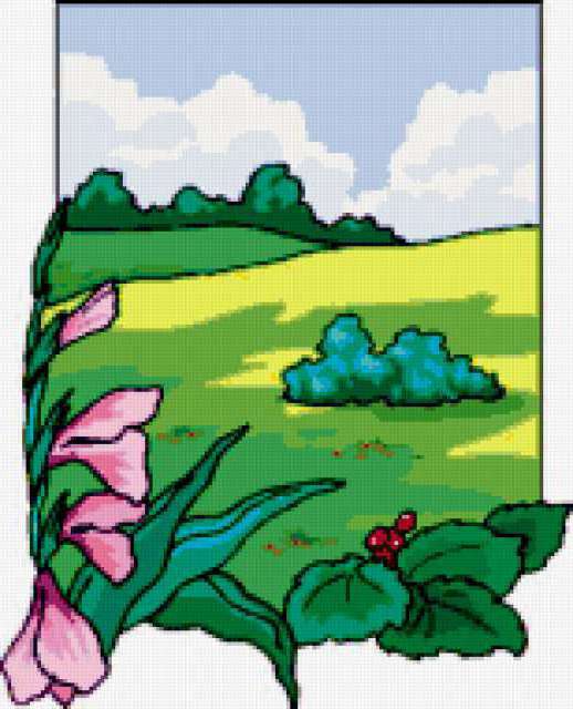 Ориентировочно так, схема вышивки «Landscape», созданная автором aniela, будет выглядеть при отшиве на канве. Размер данной вышивки равен 154x190 крестов, при этом используется 56 цветов. Ключевые слова, по которым можно найти эту схему: цветы, flowers. Также, вы можете взглянуть на оригинальную картинку, соответствующую данной схеме вышивки.