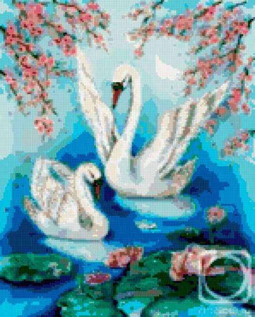 Ориентировочно так, схема вышивки «Lebedi», созданная автором lukrecija12, будет выглядеть при отшиве на канве. Размер данной вышивки равен 149x185 крестов, при этом используется 45 цветов. Ключевые слова, по которым можно найти эту схему: pticy. Также, вы можете взглянуть на оригинальную картинку, соответствующую данной схеме вышивки.