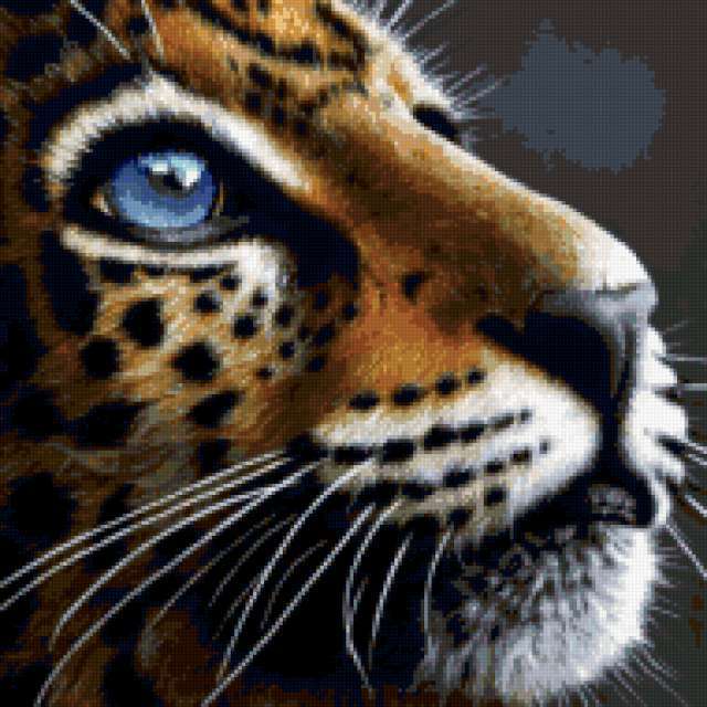 Ориентировочно так, схема вышивки «Leopard», созданная автором aniela, будет выглядеть при отшиве на канве. Размер данной вышивки равен 190x190 крестов, при этом используется 68 цветов. Ключевые слова, по которым можно найти эту схему: wildlife, animals, животные. Также, вы можете взглянуть на оригинальную картинку, соответствующую данной схеме вышивки.