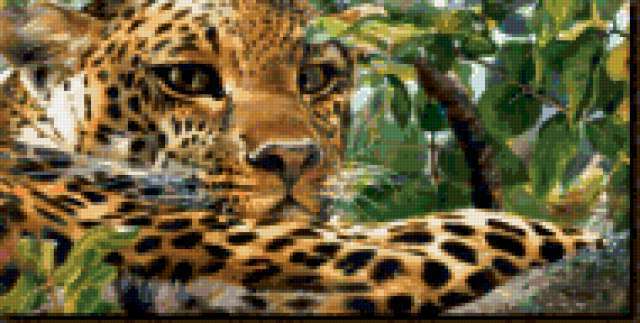 Ориентировочно так, схема вышивки «Leopard», созданная автором aniela, будет выглядеть при отшиве на канве. Размер данной вышивки равен 190x96 крестов, при этом используется 81 цветов. Ключевые слова, по которым можно найти эту схему: wildlife, animals, животные. Также, вы можете взглянуть на оригинальную картинку, соответствующую данной схеме вышивки.