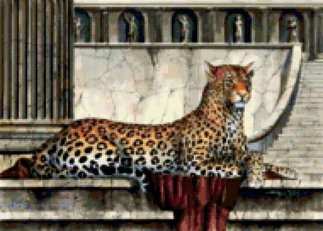 Ориентировочно так, схема вышивки «Leopard», созданная автором aniela, будет выглядеть при отшиве на канве. Размер данной вышивки равен 190x136 крестов, при этом используется 66 цветов. Ключевые слова, по которым можно найти эту схему: wildlife, animals, животные. Также, вы можете взглянуть на оригинальную картинку, соответствующую данной схеме вышивки.