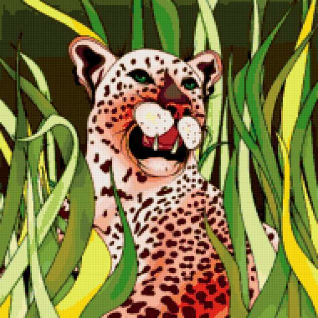 Ориентировочно так, схема вышивки «Leopard», созданная автором pandreevska, будет выглядеть при отшиве на канве. Размер данной вышивки равен 190x190 крестов, при этом используется 54 цветов. Ключевые слова, по которым можно найти эту схему: animals, животные, portrait, leopard. Также, вы можете взглянуть на оригинальную картинку, соответствующую данной схеме вышивки.