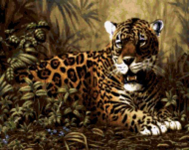 Ориентировочно так, схема вышивки «Leopard», созданная автором aniela, будет выглядеть при отшиве на канве. Размер данной вышивки равен 190x151 крестов, при этом используется 57 цветов. Ключевые слова, по которым можно найти эту схему: wildlife, animals, животные. Также, вы можете взглянуть на оригинальную картинку, соответствующую данной схеме вышивки.