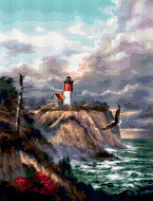 Ориентировочно так, схема вышивки «Lighthouse», созданная автором aniela, будет выглядеть при отшиве на канве. Размер данной вышивки равен 145x190 крестов, при этом используется 72 цветов. Ключевые слова, по которым можно найти эту схему: seascape, lighthouse, маяк. Также, вы можете взглянуть на оригинальную картинку, соответствующую данной схеме вышивки.
