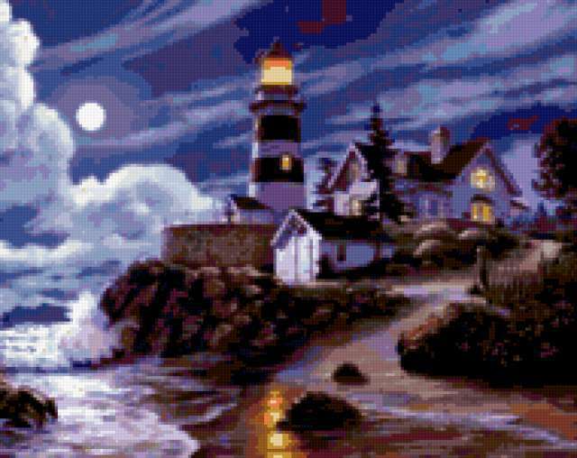Ориентировочно так, схема вышивки «Lighthouse», созданная автором aniela, будет выглядеть при отшиве на канве. Размер данной вышивки равен 190x151 крестов, при этом используется 52 цветов. Ключевые слова, по которым можно найти эту схему: seascape, lighthouse, маяк. Также, вы можете взглянуть на оригинальную картинку, соответствующую данной схеме вышивки.