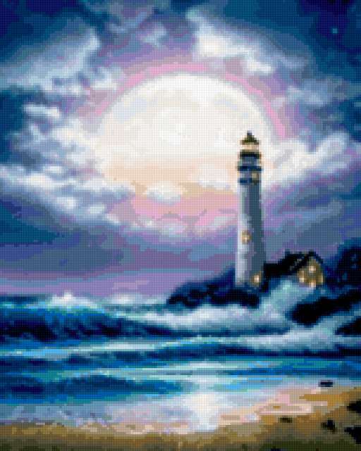 Ориентировочно так, схема вышивки «Lighthouse», созданная автором aniela, будет выглядеть при отшиве на канве. Размер данной вышивки равен 152x190 крестов, при этом используется 76 цветов. Ключевые слова, по которым можно найти эту схему: seascape, lighthouse, маяк. Также, вы можете взглянуть на оригинальную картинку, соответствующую данной схеме вышивки.