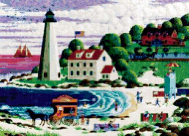 Ориентировочно так, схема вышивки «Lighthouse», созданная автором aniela, будет выглядеть при отшиве на канве. Размер данной вышивки равен 190x137 крестов, при этом используется 83 цветов. Ключевые слова, по которым можно найти эту схему: seascape, lighthouse, маяк. Также, вы можете взглянуть на оригинальную картинку, соответствующую данной схеме вышивки.