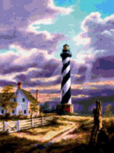 Ориентировочно так, схема вышивки «Lighthouse», созданная автором aniela, будет выглядеть при отшиве на канве. Размер данной вышивки равен 142x190 крестов, при этом используется 73 цветов. Ключевые слова, по которым можно найти эту схему: landscape, lighthouse, маяк. Также, вы можете взглянуть на оригинальную картинку, соответствующую данной схеме вышивки.