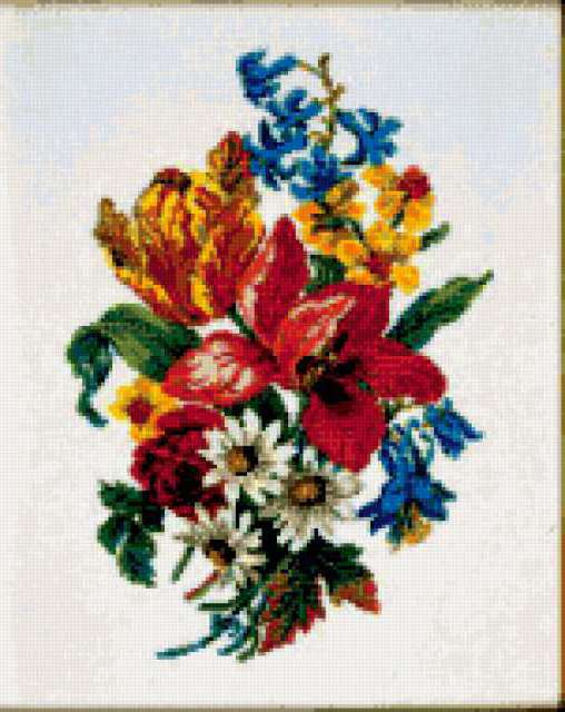 Ориентировочно так, схема вышивки «Lilled», созданная автором aniela, будет выглядеть при отшиве на канве. Размер данной вышивки равен 151x190 крестов, при этом используется 81 цветов. Ключевые слова, по которым можно найти эту схему: цветы, flowers. Также, вы можете взглянуть на оригинальную картинку, соответствующую данной схеме вышивки.