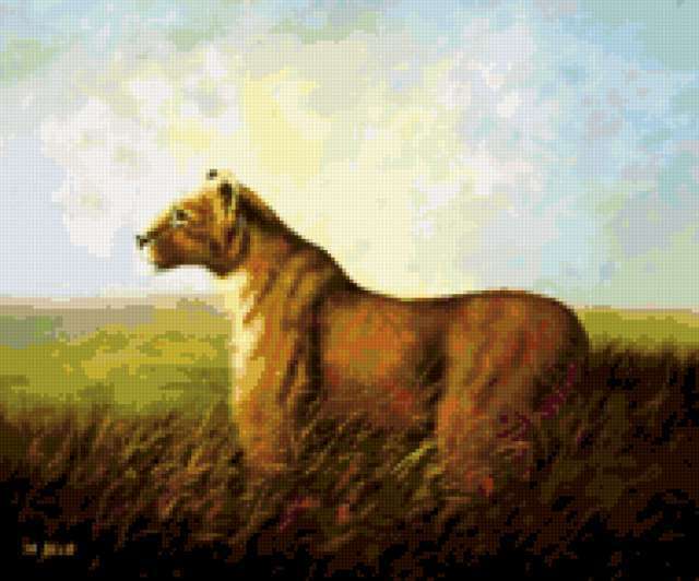 Ориентировочно так, схема вышивки «Lion», созданная автором aniela, будет выглядеть при отшиве на канве. Размер данной вышивки равен 190x158 крестов, при этом используется 58 цветов. Ключевые слова, по которым можно найти эту схему: animals, wildlife. Также, вы можете взглянуть на оригинальную картинку, соответствующую данной схеме вышивки.
