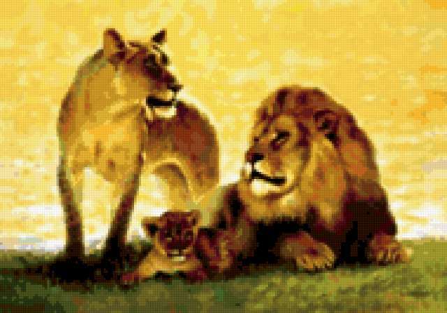 Ориентировочно так, схема вышивки «Lion», созданная автором aniela, будет выглядеть при отшиве на канве. Размер данной вышивки равен 190x133 крестов, при этом используется 64 цветов. Ключевые слова, по которым можно найти эту схему: wildlife, animals, животные, львы. Также, вы можете взглянуть на оригинальную картинку, соответствующую данной схеме вышивки.