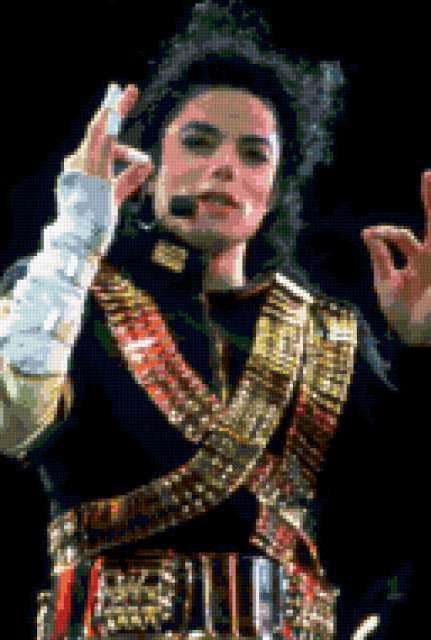 Ориентировочно так, схема вышивки «MJ», созданная автором mariannag78, будет выглядеть при отшиве на канве. Размер данной вышивки равен 128x190 крестов, при этом используется 73 цветов. Ключевые слова, по которым можно найти эту схему: майкл джексон, звезда, король. Также, вы можете взглянуть на оригинальную картинку, соответствующую данной схеме вышивки.