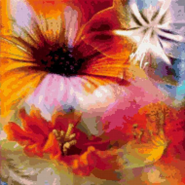 Ориентировочно так, схема вышивки «Magic Flowers 40», созданная автором pandreevska, будет выглядеть при отшиве на канве. Размер данной вышивки равен 190x190 крестов, при этом используется 75 цветов. Ключевые слова, по которым можно найти эту схему: цветы, абстракт, фентези. Также, вы можете взглянуть на оригинальную картинку, соответствующую данной схеме вышивки.