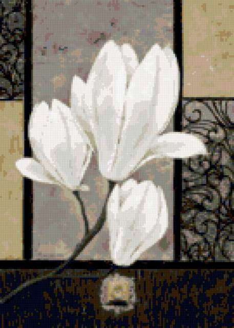 Ориентировочно так, схема вышивки «Magnolia», созданная автором lukrecija12, будет выглядеть при отшиве на канве. Размер данной вышивки равен 135x189 крестов, при этом используется 27 цветов. Ключевые слова, по которым можно найти эту схему: flowers. Также, вы можете взглянуть на оригинальную картинку, соответствующую данной схеме вышивки.
