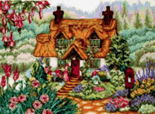 Ориентировочно так, схема вышивки «Majake», созданная автором aniela, будет выглядеть при отшиве на канве. Размер данной вышивки равен 190x140 крестов, при этом используется 93 цветов. Ключевые слова, по которым можно найти эту схему: пейзаж, архитэктура, домики, cottage. Также, вы можете взглянуть на оригинальную картинку, соответствующую данной схеме вышивки.