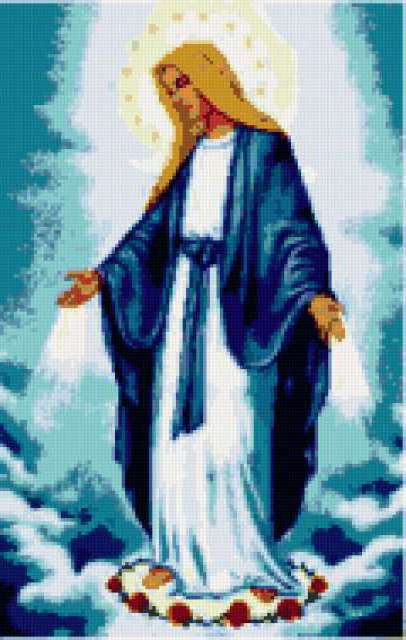 Ориентировочно так, схема вышивки «Maria», созданная автором elli0608, будет выглядеть при отшиве на канве. Размер данной вышивки равен 120x189 крестов, при этом используется 38 цветов. К несчастью, автор не назначил для схемы ключевые слова. Также, вы можете взглянуть на оригинальную картинку, соответствующую данной схеме вышивки.
