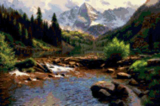 Ориентировочно так, схема вышивки «Mark Keathley», созданная автором Fardo, будет выглядеть при отшиве на канве. Размер данной вышивки равен 190x126 крестов, при этом используется 75 цветов. Ключевые слова, по которым можно найти эту схему: пейзажи, природа, лето, вода, mark keathley. Также, вы можете взглянуть на оригинальную картинку, соответствующую данной схеме вышивки.