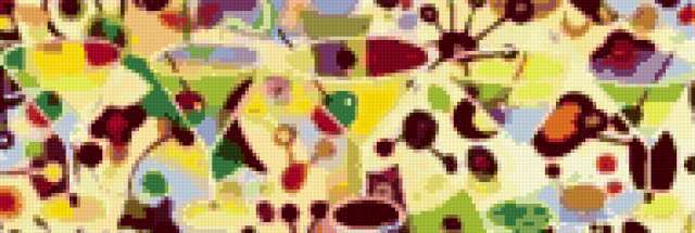 Ориентировочно так, схема вышивки «Martini Decoration», созданная автором me4o, будет выглядеть при отшиве на канве. Размер данной вышивки равен 190x64 крестов, при этом используется 48 цветов. Ключевые слова, по которым можно найти эту схему: cocktail, decoration, martini, delicious, exotic, kitchen. Также, вы можете взглянуть на оригинальную картинку, соответствующую данной схеме вышивки.