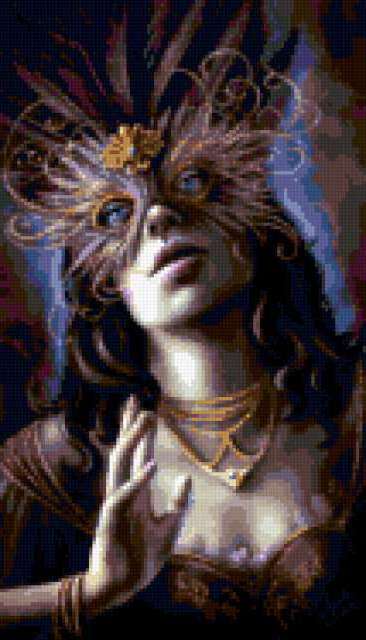 Ориентировочно так, схема вышивки «Maskarad», созданная автором lukrecija12, будет выглядеть при отшиве на канве. Размер данной вышивки равен 107x187 крестов, при этом используется 38 цветов. Ключевые слова, по которым можно найти эту схему: zenshina, karnaval. Также, вы можете взглянуть на оригинальную картинку, соответствующую данной схеме вышивки.