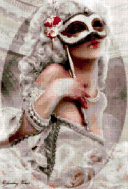 Ориентировочно так, схема вышивки «Maskarad», созданная автором lukrecija12, будет выглядеть при отшиве на канве. Размер данной вышивки равен 121x179 крестов, при этом используется 54 цветов. Ключевые слова, по которым можно найти эту схему: zenshina, karnaval. Также, вы можете взглянуть на оригинальную картинку, соответствующую данной схеме вышивки.