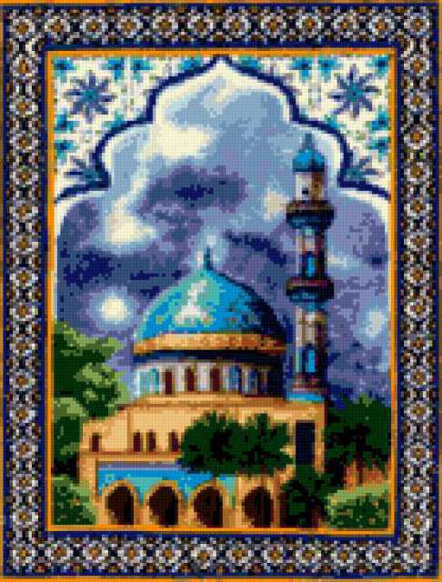 Ориентировочно так, схема вышивки «Mechet», созданная автором lukrecija12, будет выглядеть при отшиве на канве. Размер данной вышивки равен 139x183 крестов, при этом используется 50 цветов. Ключевые слова, по которым можно найти эту схему: vostok. Также, вы можете взглянуть на оригинальную картинку, соответствующую данной схеме вышивки.