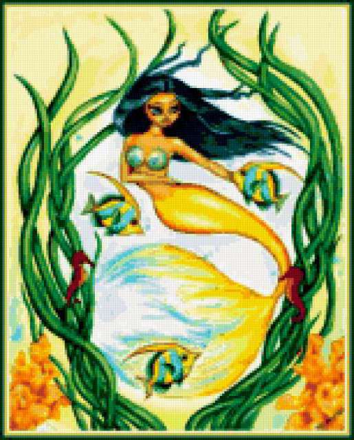 Ориентировочно так, схема вышивки «Mermaid», созданная автором aniela, будет выглядеть при отшиве на канве. Размер данной вышивки равен 153x190 крестов, при этом используется 76 цветов. Ключевые слова, по которым можно найти эту схему: mermaid, fantasy. Также, вы можете взглянуть на оригинальную картинку, соответствующую данной схеме вышивки.