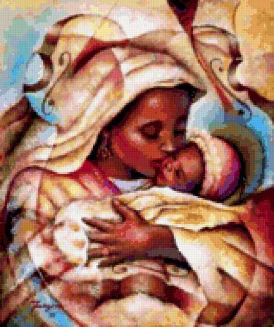 Ориентировочно так, схема вышивки «Motherhood», созданная автором iborissova, будет выглядеть при отшиве на канве. Размер данной вышивки равен 159x190 крестов, при этом используется 84 цветов. Ключевые слова, по которым можно найти эту схему: женщина. Также, вы можете взглянуть на оригинальную картинку, соответствующую данной схеме вышивки.