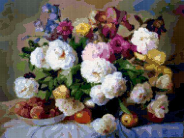 Ориентировочно так, схема вышивки «Natiurmort», созданная автором lukrecija12, будет выглядеть при отшиве на канве. Размер данной вышивки равен 190x143 крестов, при этом используется 61 цветов. Ключевые слова, по которым можно найти эту схему: cvety, natiurmort. Также, вы можете взглянуть на оригинальную картинку, соответствующую данной схеме вышивки.