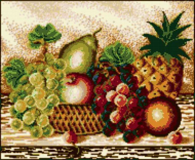 Ориентировочно так, схема вышивки «Natiurmort», созданная автором lukrecija12, будет выглядеть при отшиве на канве. Размер данной вышивки равен 190x156 крестов, при этом используется 32 цветов. Ключевые слова, по которым можно найти эту схему: natiurmort. Также, вы можете взглянуть на оригинальную картинку, соответствующую данной схеме вышивки.