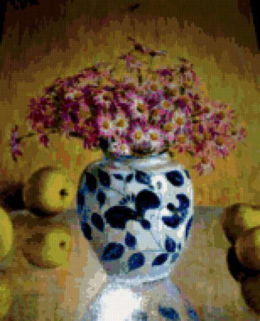 Ориентировочно так, схема вышивки «Naturmort», созданная автором aniela, будет выглядеть при отшиве на канве. Размер данной вышивки равен 154x190 крестов, при этом используется 75 цветов. Ключевые слова, по которым можно найти эту схему: натюрморт, цветы, flowers, naturmort. Также, вы можете взглянуть на оригинальную картинку, соответствующую данной схеме вышивки.