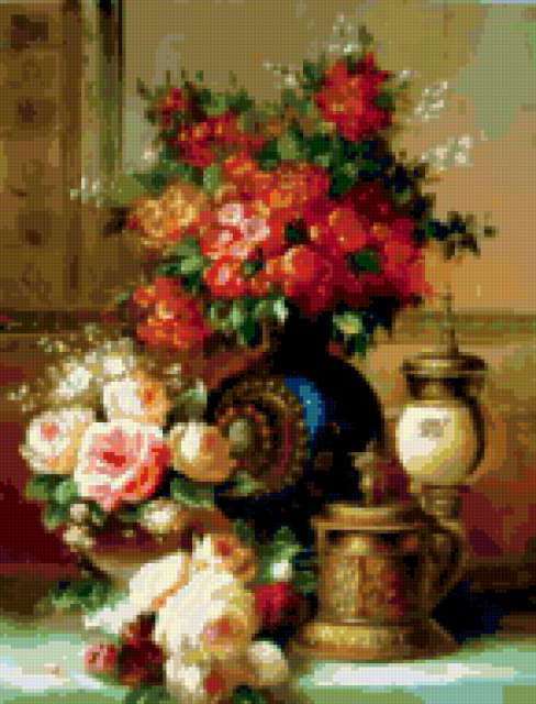 Ориентировочно так, схема вышивки «Naturmort», созданная автором aniela, будет выглядеть при отшиве на канве. Размер данной вышивки равен 145x190 крестов, при этом используется 79 цветов. Ключевые слова, по которым можно найти эту схему: натюрморт, цветы, flowers, naturmort. Также, вы можете взглянуть на оригинальную картинку, соответствующую данной схеме вышивки.