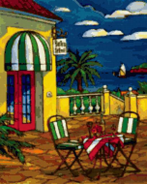 Ориентировочно так, схема вышивки «On the Beach», созданная автором pandreevska, будет выглядеть при отшиве на канве. Размер данной вышивки равен 152x190 крестов, при этом используется 60 цветов. Ключевые слова, по которым можно найти эту схему: bright, paradise, decoration, sea . Также, вы можете взглянуть на оригинальную картинку, соответствующую данной схеме вышивки.