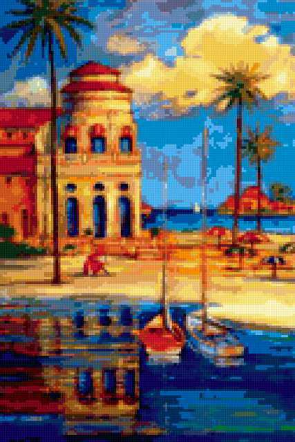 Ориентировочно так, схема вышивки «On the Beach», созданная автором pandreevska, будет выглядеть при отшиве на канве. Размер данной вышивки равен 127x190 крестов, при этом используется 64 цветов. Ключевые слова, по которым можно найти эту схему: bright, paradise, decoration, sea . Также, вы можете взглянуть на оригинальную картинку, соответствующую данной схеме вышивки.