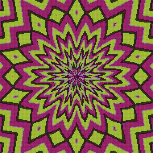 Ориентировочно так, схема вышивки «Pattern», созданная автором ludaokafor, будет выглядеть при отшиве на канве. Размер данной вышивки равен 190x190 крестов, при этом используется 5 цветов. Ключевые слова, по которым можно найти эту схему: pattern. Также, вы можете взглянуть на оригинальную картинку, соответствующую данной схеме вышивки.