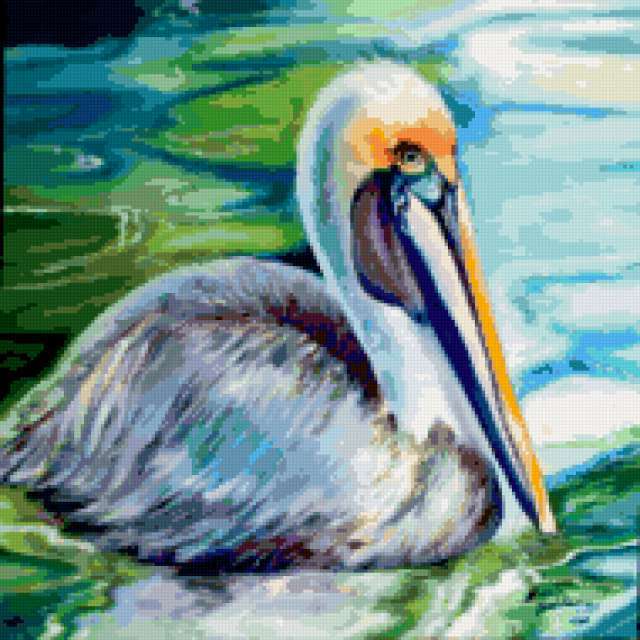 Ориентировочно так, схема вышивки «Pelican», созданная автором aniela, будет выглядеть при отшиве на канве. Размер данной вышивки равен 190x190 крестов, при этом используется 83 цветов. Ключевые слова, по которым можно найти эту схему: wildlife, birds, птицы. Также, вы можете взглянуть на оригинальную картинку, соответствующую данной схеме вышивки.