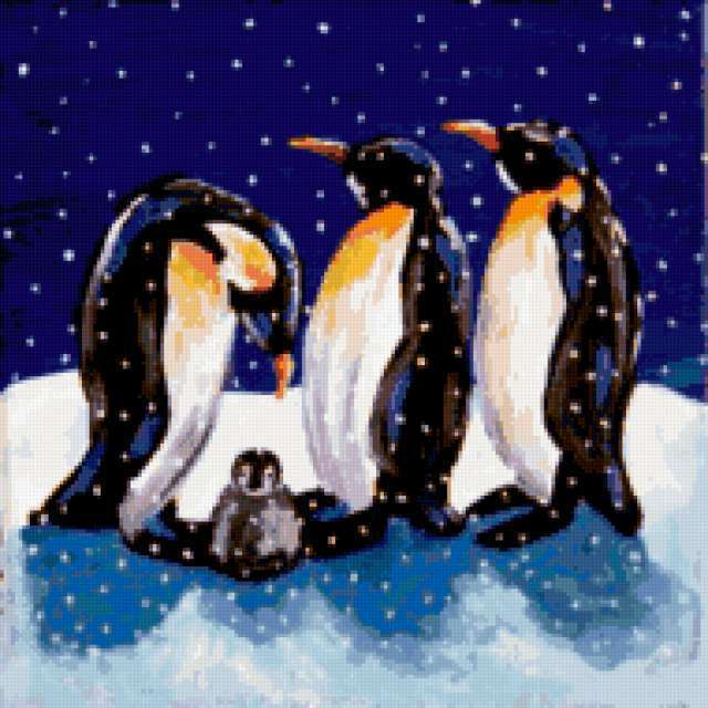 Ориентировочно так, схема вышивки «Penguin Family», созданная автором pandreevska, будет выглядеть при отшиве на канве. Размер данной вышивки равен 190x190 крестов, при этом используется 61 цветов. Ключевые слова, по которым можно найти эту схему: animals, bird, cute, colorful, family, love. Также, вы можете взглянуть на оригинальную картинку, соответствующую данной схеме вышивки.