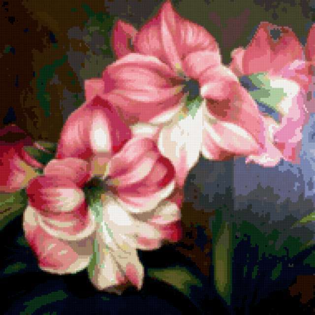 Ориентировочно так, схема вышивки «Pink Amarillis», созданная автором pandreevska, будет выглядеть при отшиве на канве. Размер данной вышивки равен 190x190 крестов, при этом используется 59 цветов. Ключевые слова, по которым можно найти эту схему: flower, pink, decoration. Также, вы можете взглянуть на оригинальную картинку, соответствующую данной схеме вышивки.