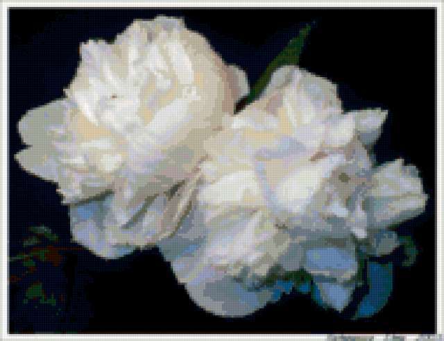 Ориентировочно так, схема вышивки «Piony», созданная автором lukrecija12, будет выглядеть при отшиве на канве. Размер данной вышивки равен 190x146 крестов, при этом используется 50 цветов. Ключевые слова, по которым можно найти эту схему: cvety. Также, вы можете взглянуть на оригинальную картинку, соответствующую данной схеме вышивки.