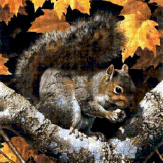 Ориентировочно так, схема вышивки «Podushka V1», созданная автором Lamisa, будет выглядеть при отшиве на канве. Размер данной вышивки равен 190x190 крестов, при этом используется 69 цветов. Ключевые слова, по которым можно найти эту схему: животные, белки, осень, подушка. Также, вы можете взглянуть на оригинальную картинку, соответствующую данной схеме вышивки.