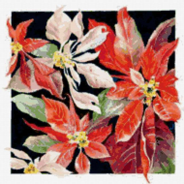 Ориентировочно так, схема вышивки «Poinsettia», созданная автором pandreevska, будет выглядеть при отшиве на канве. Размер данной вышивки равен 190x190 крестов, при этом используется 59 цветов. Ключевые слова, по которым можно найти эту схему: flower, colorful, bright, christmas. Также, вы можете взглянуть на оригинальную картинку, соответствующую данной схеме вышивки.
