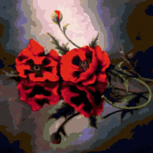 Ориентировочно так, схема вышивки «Poppy», созданная автором lukrecija12, будет выглядеть при отшиве на канве. Размер данной вышивки равен 190x190 крестов, при этом используется 39 цветов. Ключевые слова, по которым можно найти эту схему: cvety. Также, вы можете взглянуть на оригинальную картинку, соответствующую данной схеме вышивки.